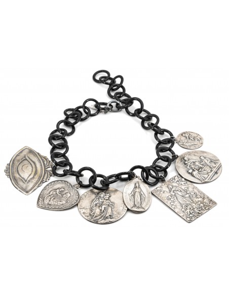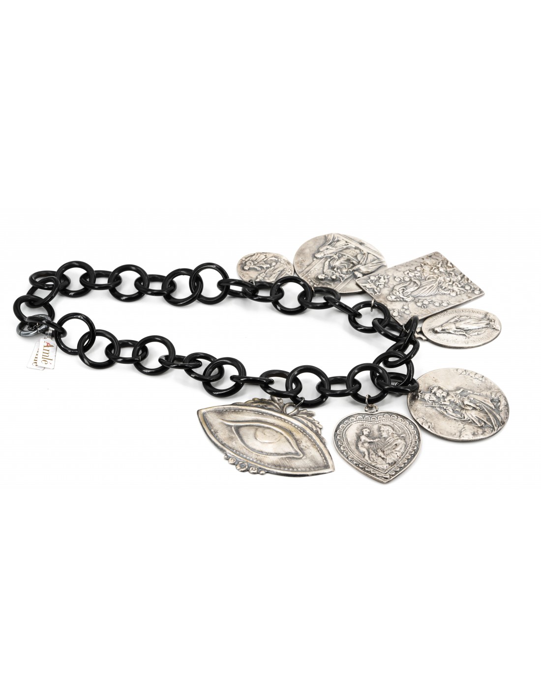 Collana Amlè in Corno Nero e Medaglie Miracolose in Argento (925) Brunito. Lunghezza Regolabile.