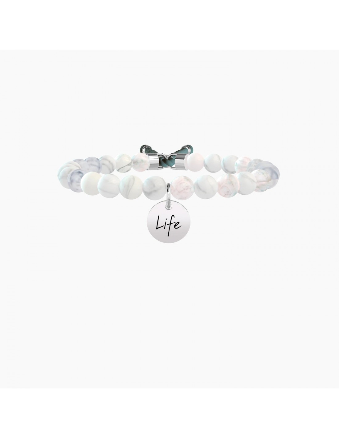 Bracciale elastico con sfere sfaccettate in aulite bianca e dettagli in acciaio.