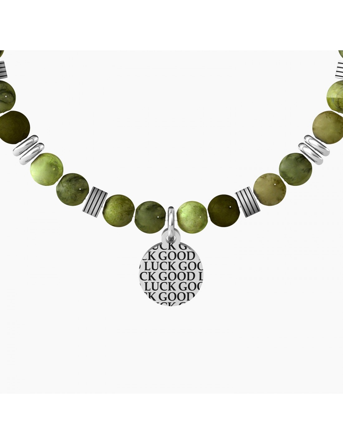 La tenacia, la determinazione e anche la forza pi straordinaria, per vincere hanno bisogno di un tocco di fortuna. Bracciale elastico in acciaio con cilindri e anelli alternati a sfere in diaspro verde, con ciondolo satinato tondo nero.