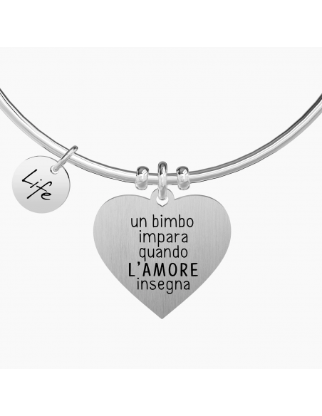 Insegnare con amore l'unico modo per dare forma a piccole menti e trasformarle in grandi uomini. Bangle in acciaio con ciondolo satinato a cuore.