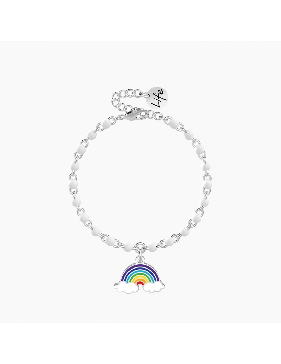Sorridi alle avversit, guarda il sole dietro le nuvole. é proprio in un giorno di pioggia che spunter l'arcobaleno. Bracciale in acciaio con ciondolo ad arcobaleno smaltato e catena rol con inserimenti in smalto bianco.
