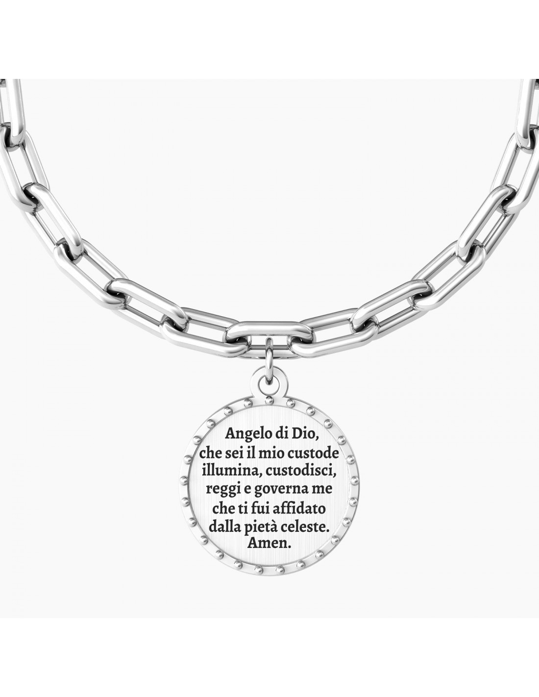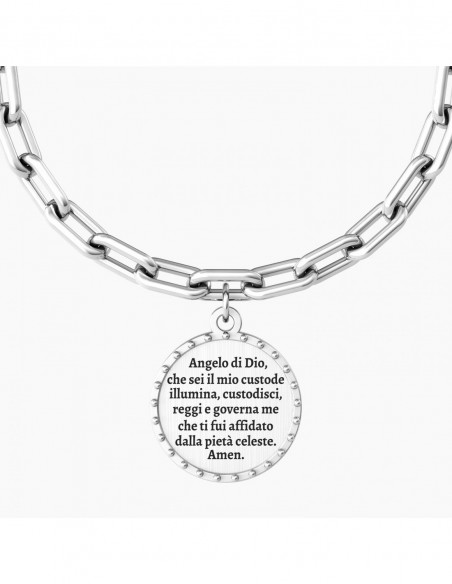 Angelo di Dio, che sei il mio custode illumina, custodisci, reggi e governa me che ti fui affidato dalla pietˆ celeste. Amen. Bracciale in acciaio con catena a maglie ovali "comfort fit" e ciondolo satinato tondo con rifinitura borchiata e cristallo.