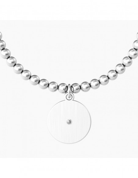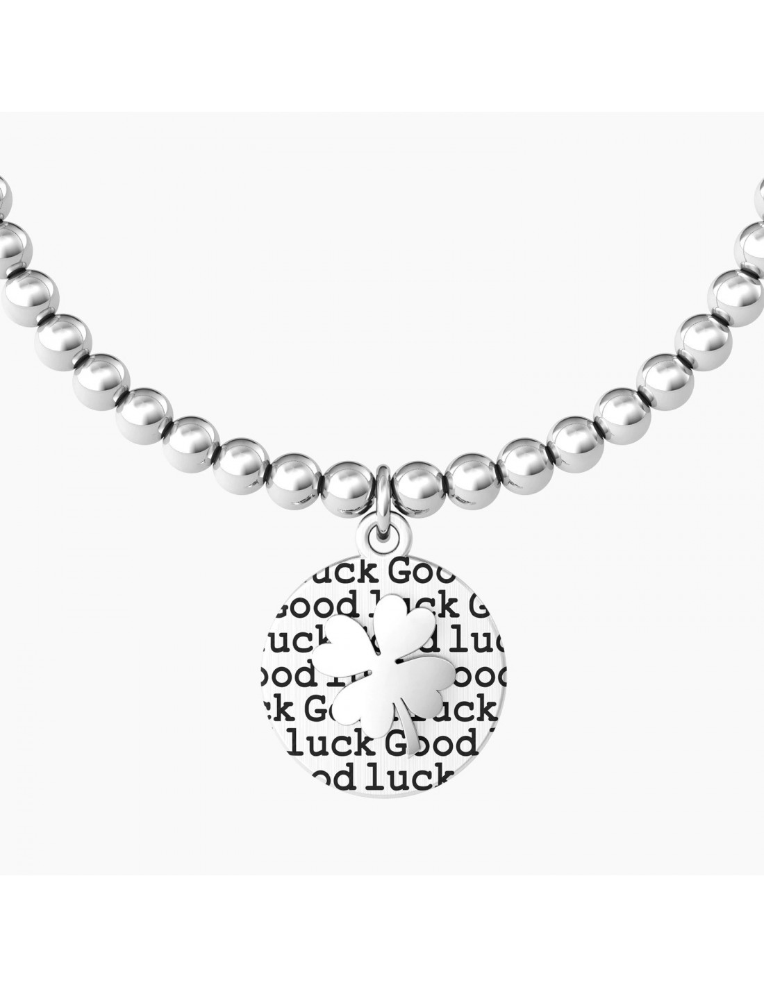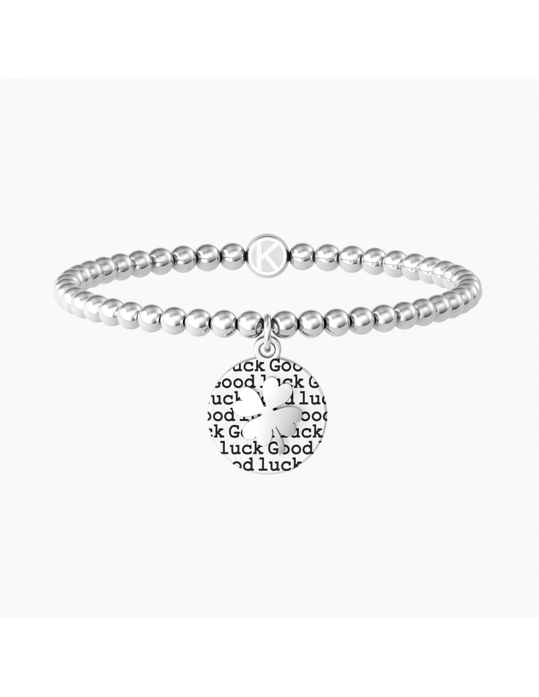 Il prato nasconde un verde talismano, se la fortuna ti vede ti prende per mano. Ricchezza, amore e amicizia sincera, con quattro foglie il tuo sogno si avvera! Bracciale elastico con sfere in acciaio e ciondolo satinato tondo con quadrifoglio in rilievo e cristallo.