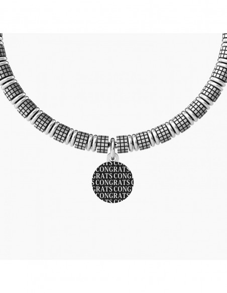 E questo solo l'inizio di un mondo di soddisfazioni. Congratulazioni Dottore, siamo davvero orgogliosi di te! Bracciale in acciaio con cilindri e anelli, con ciondolo satinato tondo con retro nero.