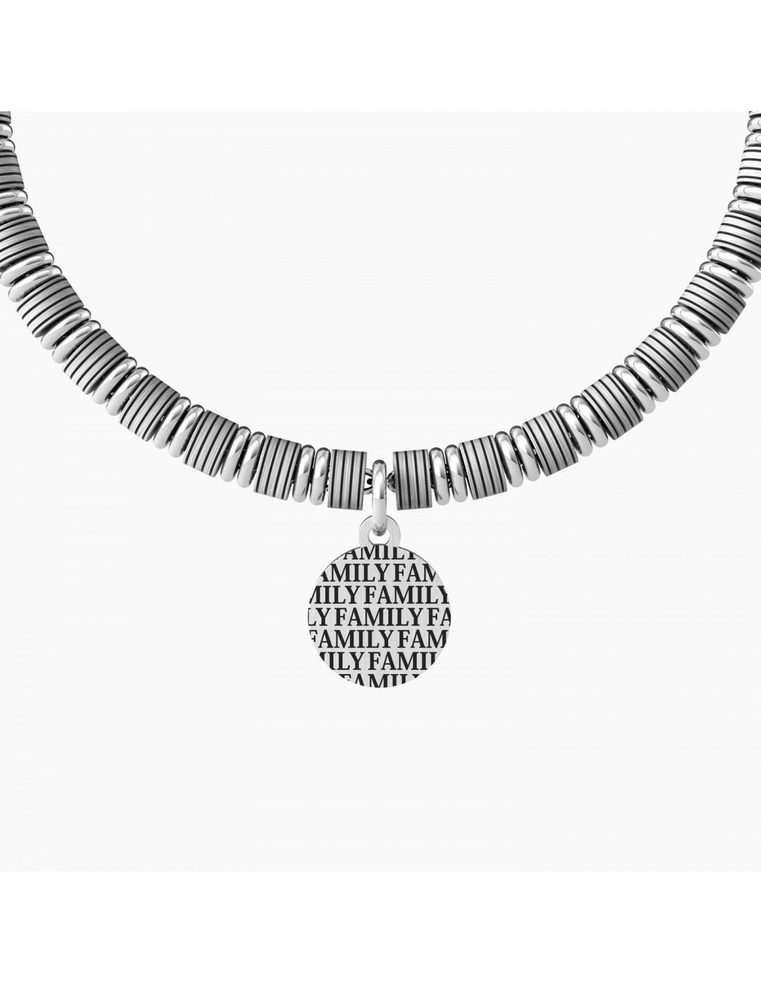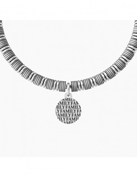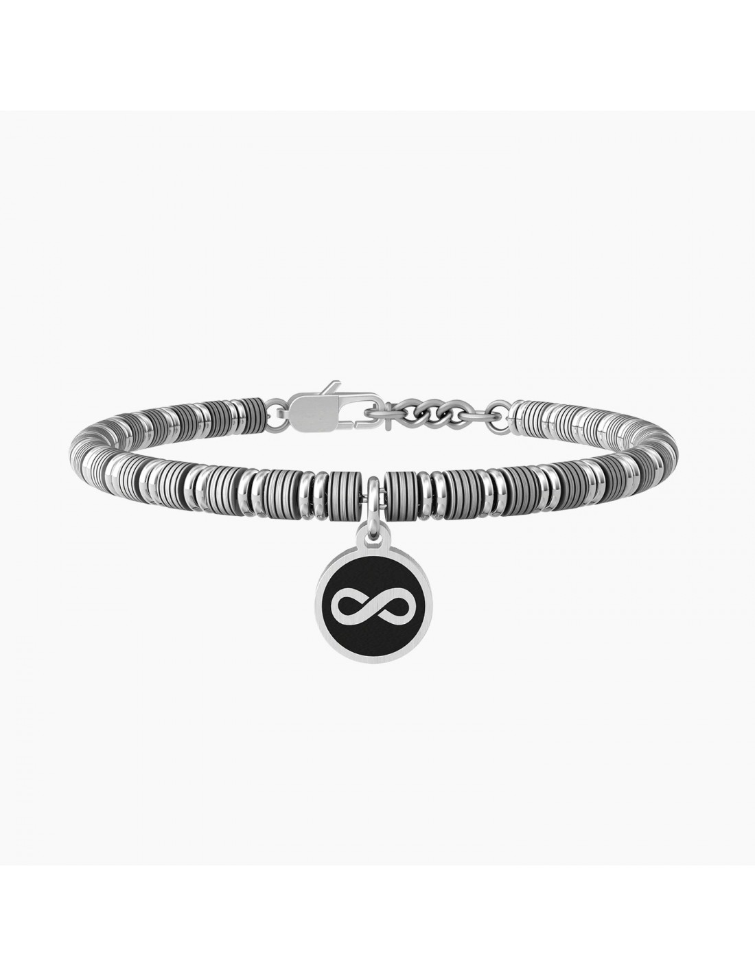 Bracciale in acciaio con cilindri e anelli, con ciondolo tondo nero.