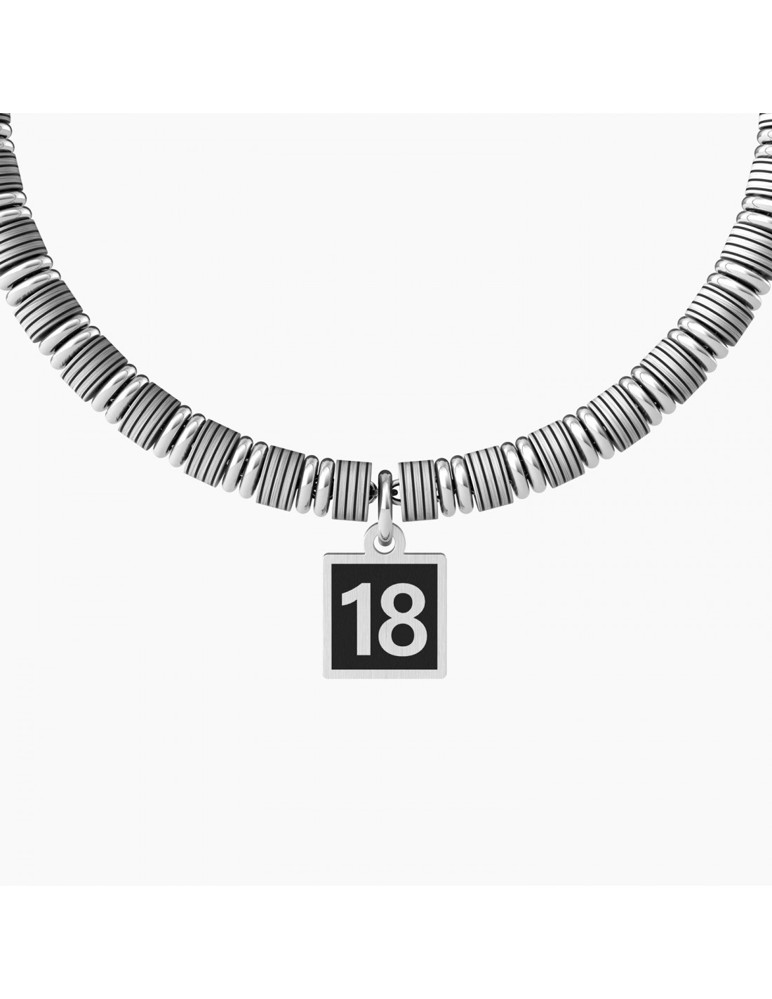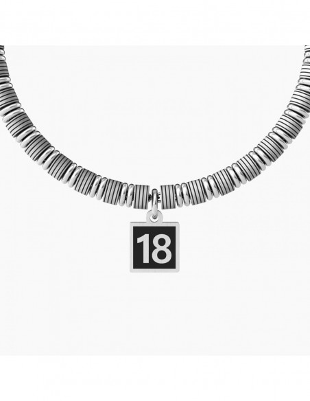 Davanti a te tanti confini da superare, mete da raggiungere, un mondo da esplorare. Il meglio deve ancora venire! Buon compleanno! Bracciale in acciaio con cilindri e anelli, con ciondolo satinato quadrato nero.