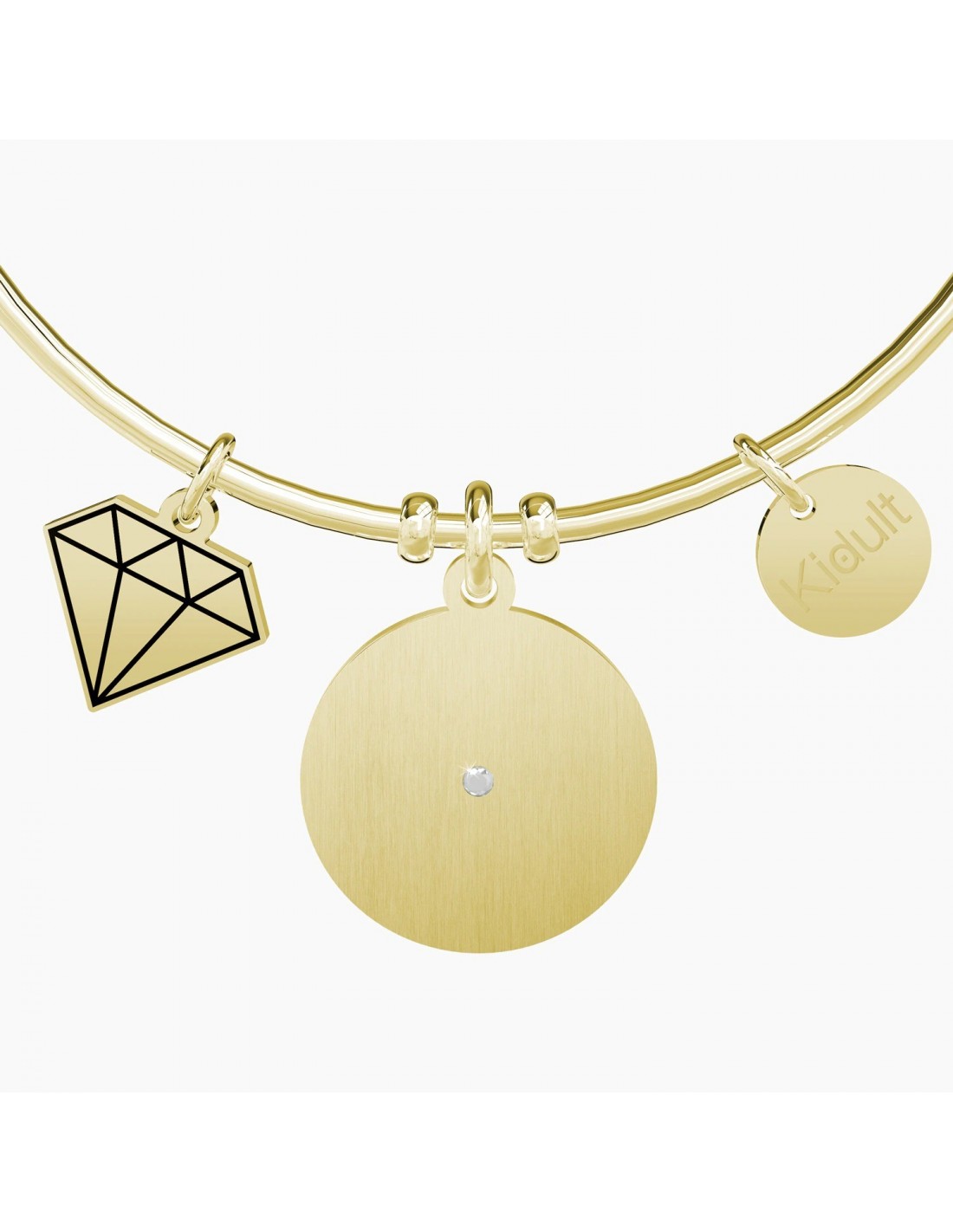 Ci siamo trovate per caso, ma da quel giorno non ci siamo pi lasciate. Non rinuncerei alla nostra amicizia per tutto l'oro del mondo, perchŽ non c' tesoro pi prezioso. "Who finds a friend finds a tresure" "Chi trova un amico trova un tesoro" Bangle in acciaio color oro giallo con ciondoli satinato tondo e a forma di diamante.