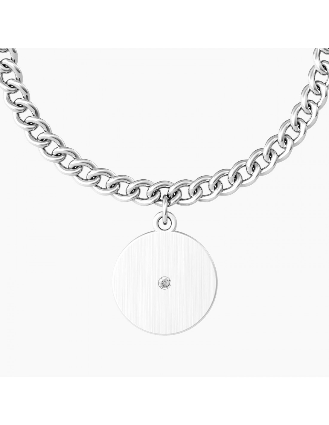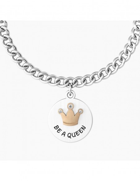Forte, intelligente e coraggiosa. Sei nata per essere regina, per guidare chi ti sta accanto nelle avventure della vita. Bracciale in acciaio con catena groumette "comfort fit" e ciondolo satinato tondo con corona in rilievo color oro rosa e cristalli.