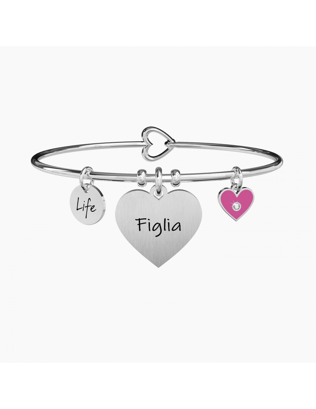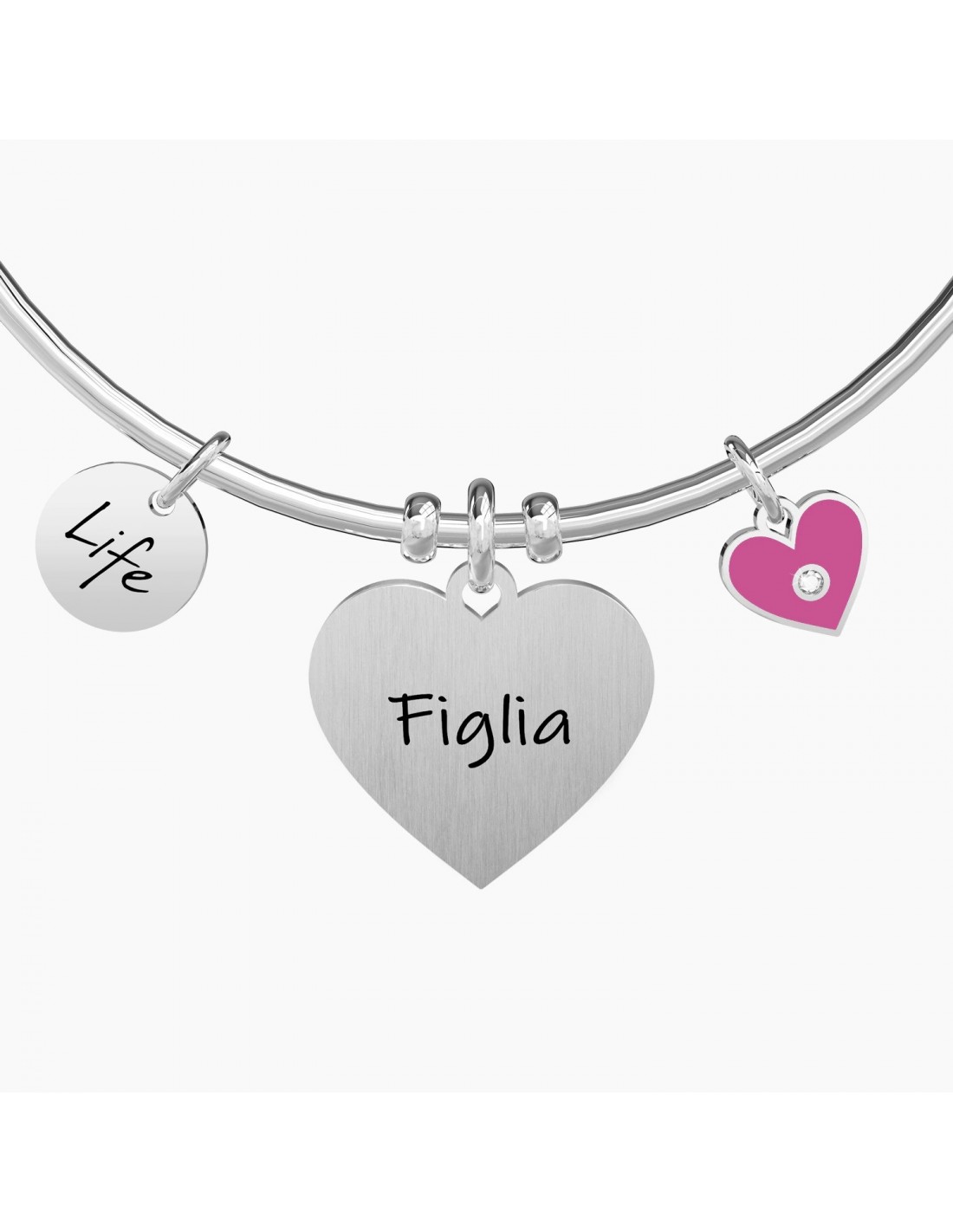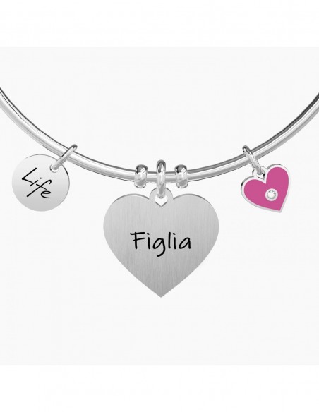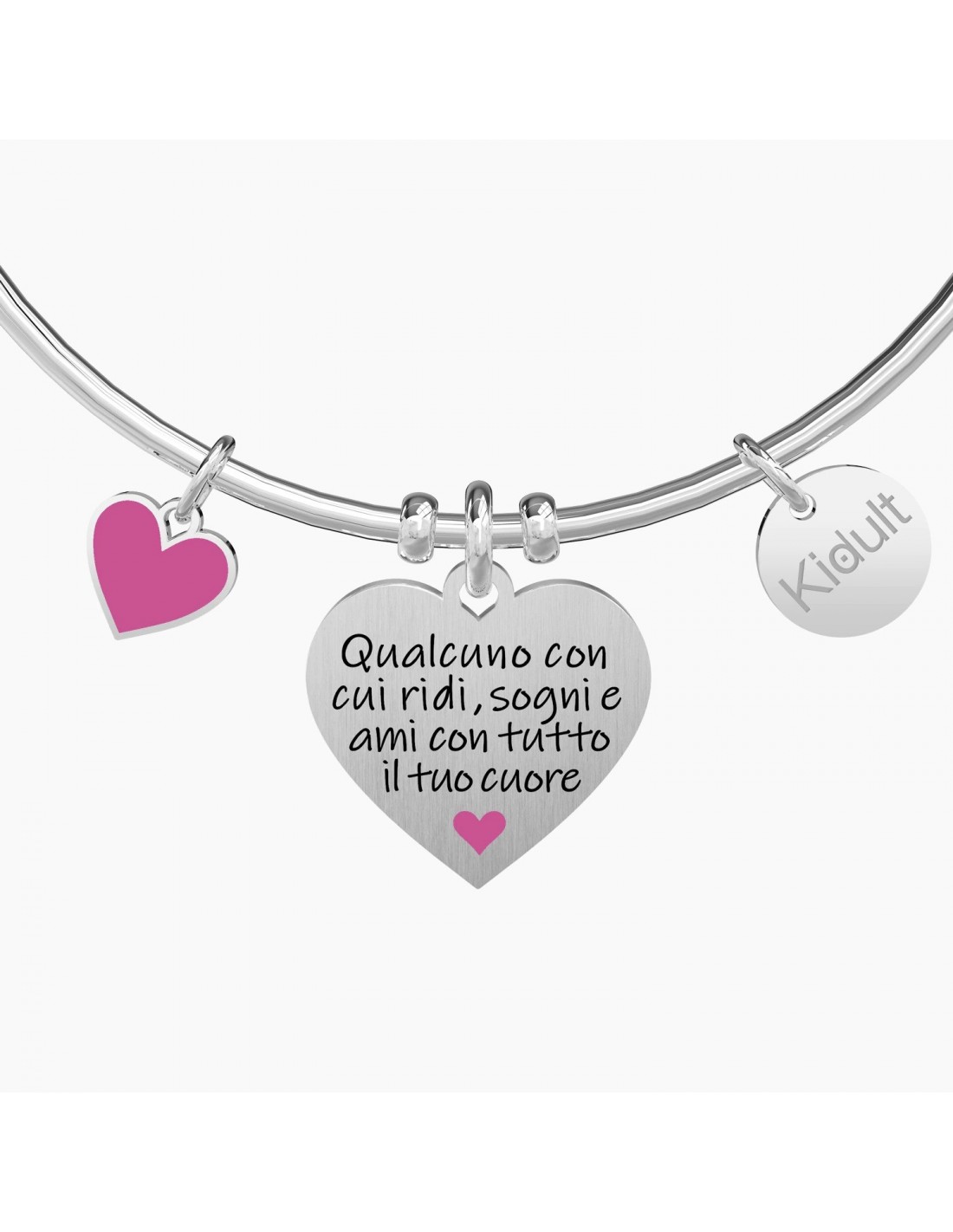Bangle in acciaio con ciondolo satinato a cuore e piccolo ciondolo a cuore smaltato rosa.