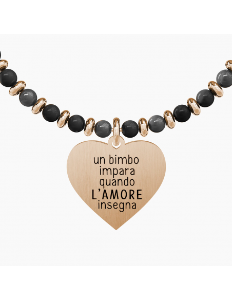 Bangle con filo armonico in acciaio, sfere sfaccettate in labradorite grigia e ciondolo satinato a cuore color oro rosa.