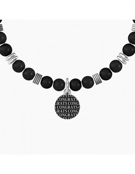 E questo  solo l'inizio di un mondo di soddisfazioni. Congratulazioni Dottore, siamo davvero orgogliosi di te! Bracciale elastico in acciaio con cilindri e anelli alternati a sfere in onice, con ciondolo satinato tondo con retro nero.