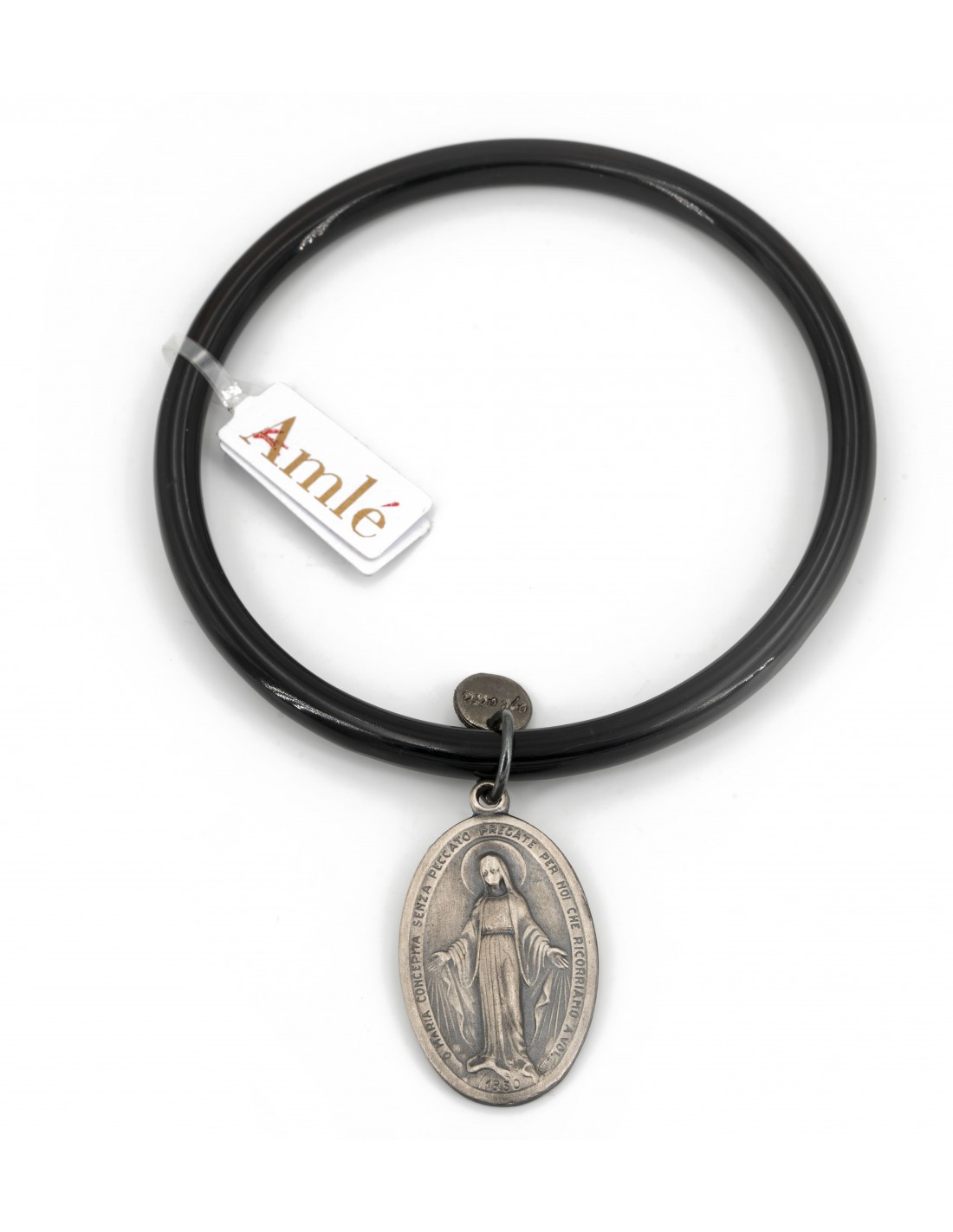 Bracciale Amlè in Corno Nero e Medaglietta in Argento Brunito con Raffigurazione della S.S Vergine Maria.