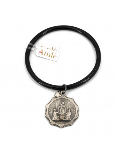 Bracciale Amlè in Corno Nero e Medaglietta in Argento Brunito Ricordo con Raffigurazione Del Santuario di Pompei e Vergine S.S del Rosario.