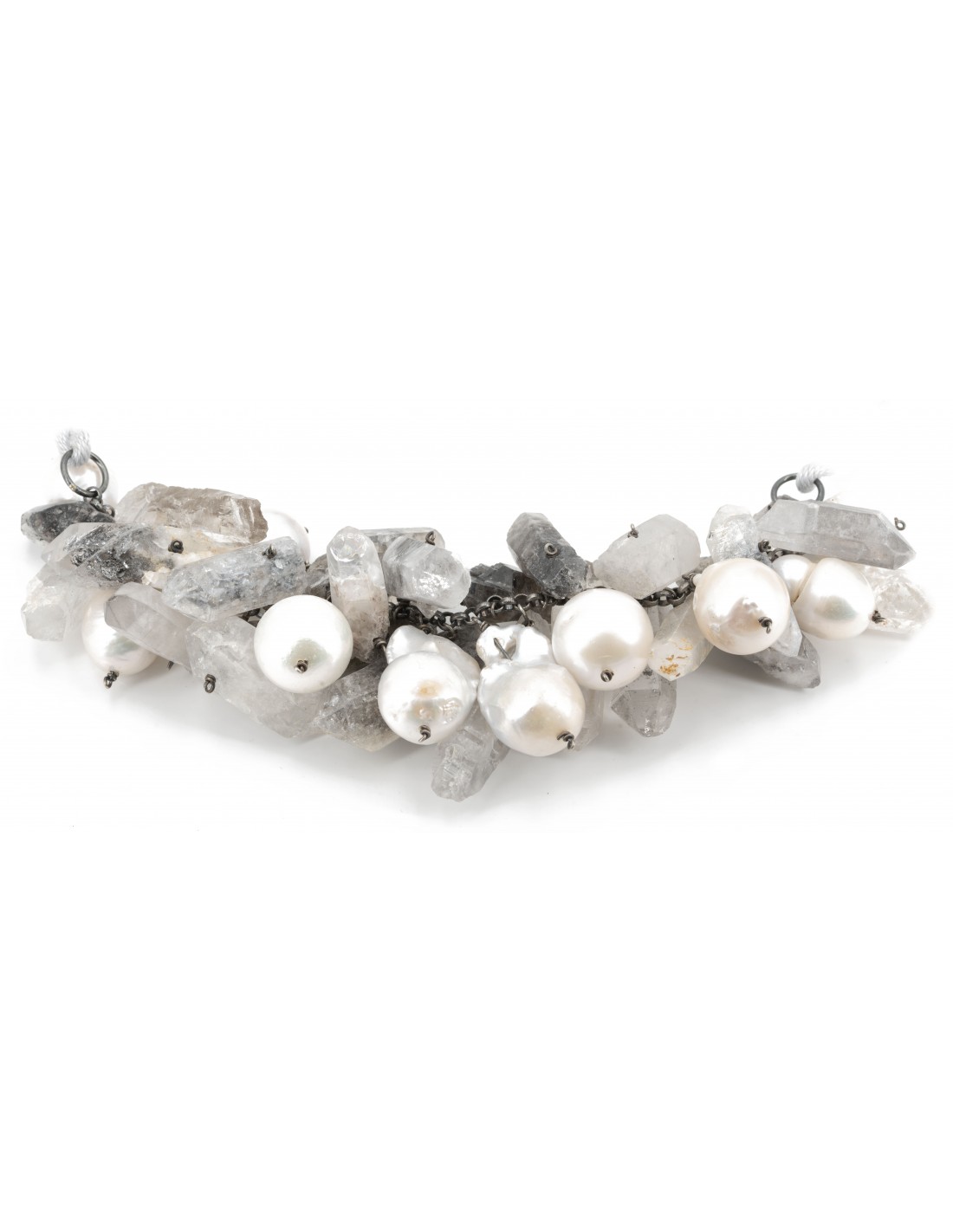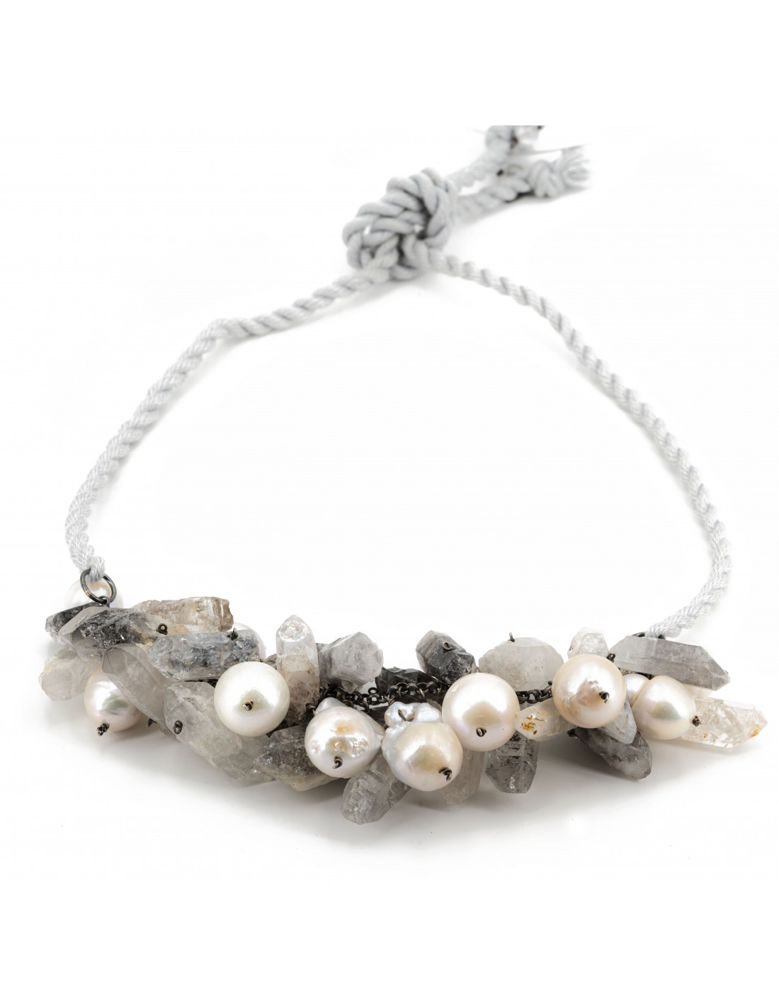 Collana Amlè in cordino Grigio, Perle e Pietre Naturali. Misura Regolabile.