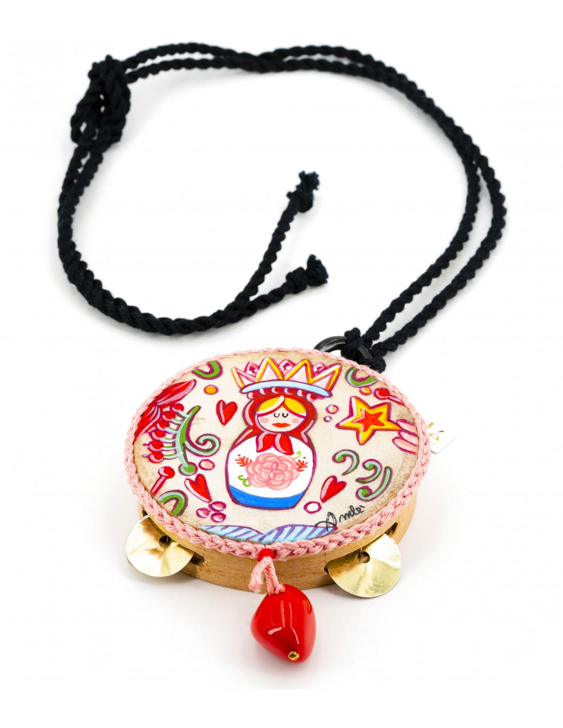 Collana Amlè in cordino Nero con Tamburello Decorato a Mano, Corno e Pietra Naturale