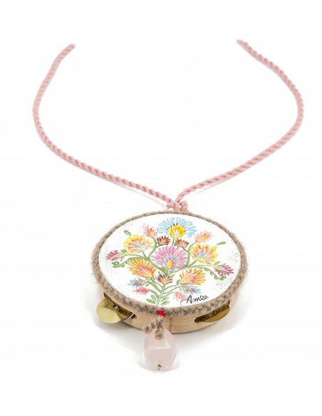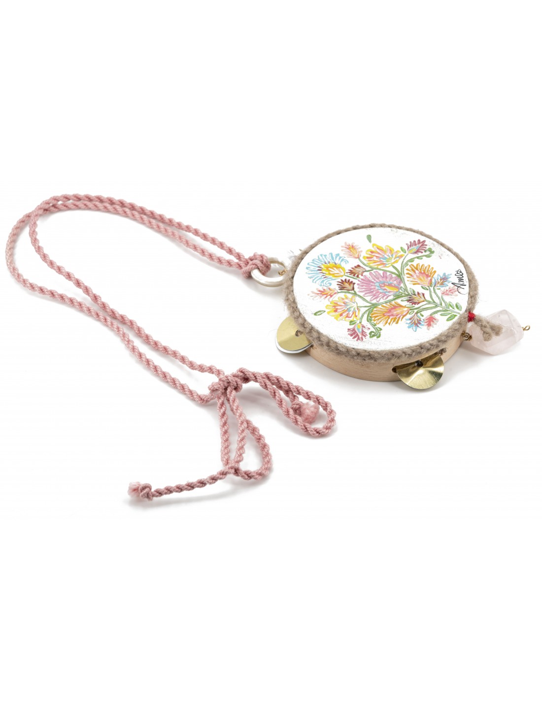 Collana Amlè in cordino Rosa con Tamburello in Legno e Pelle Decorato a Mano, Corno Bianco sfumato, Quarzo Rosa e Argento (925). Misura regolabile.