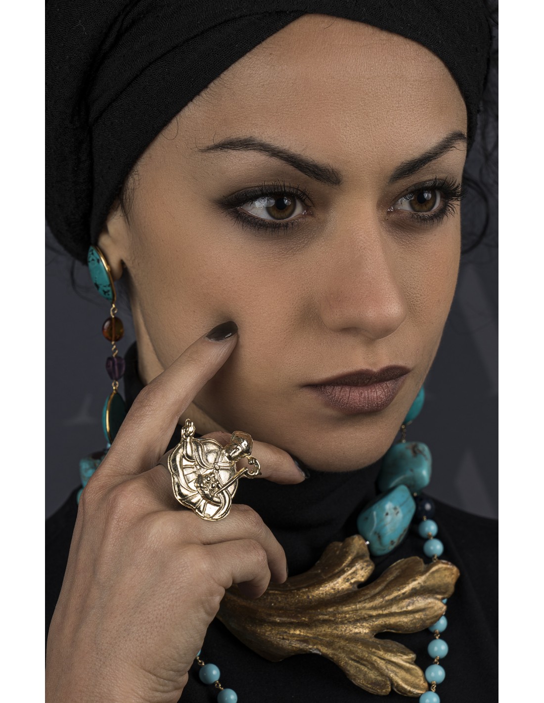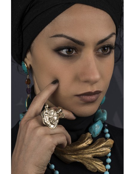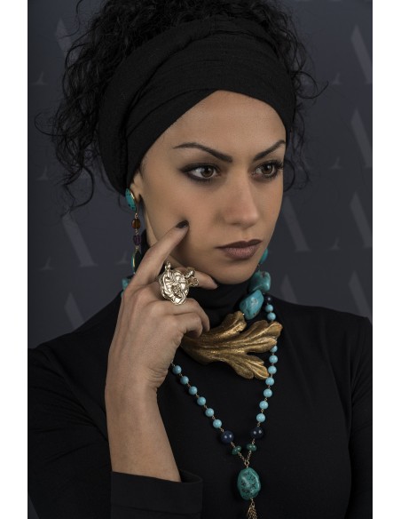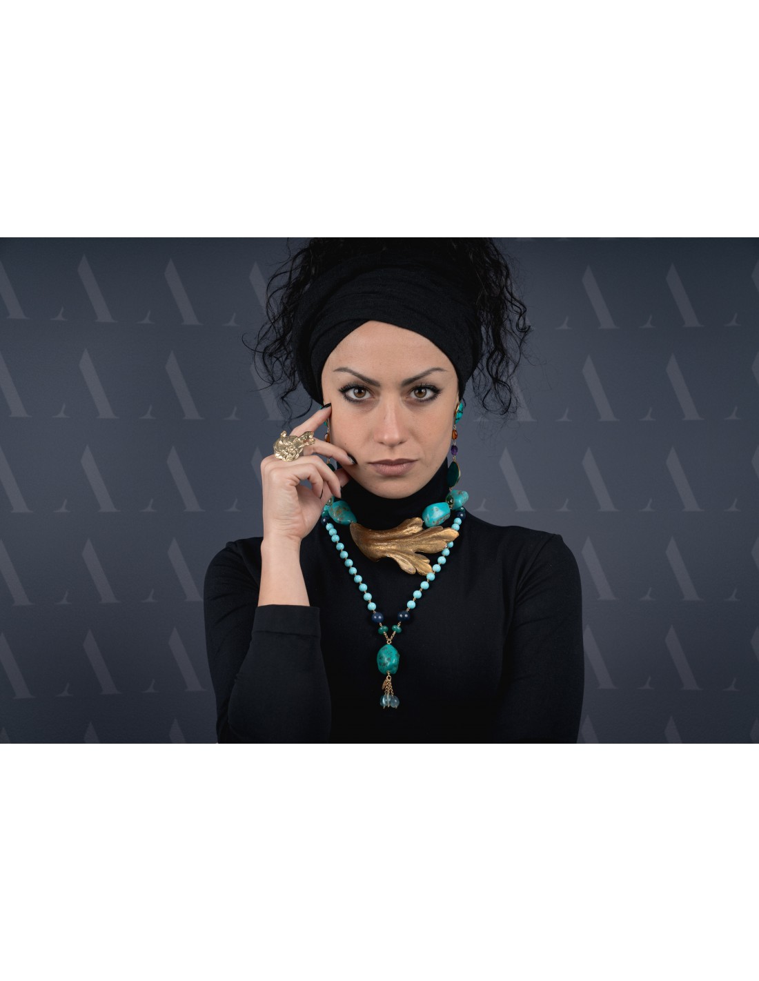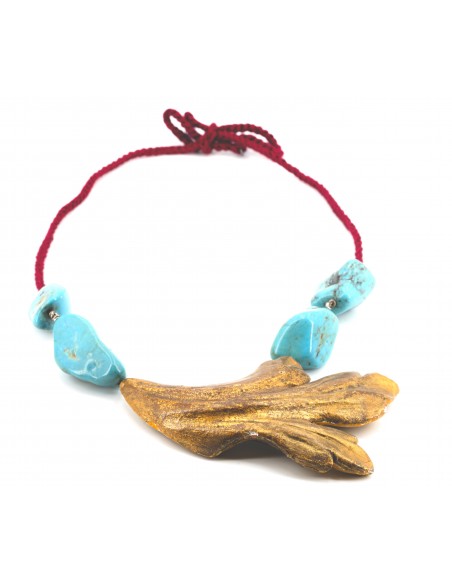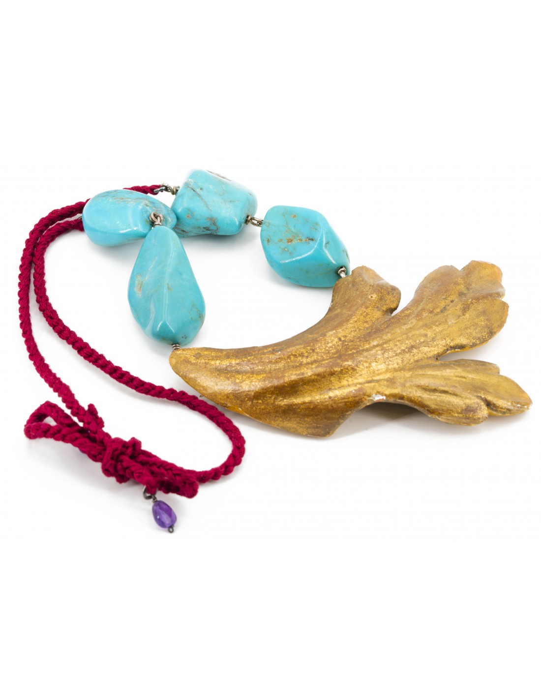 Collana Amlè in Cordino Rosso con Pietre Turchese e Fregio in Legno Antico