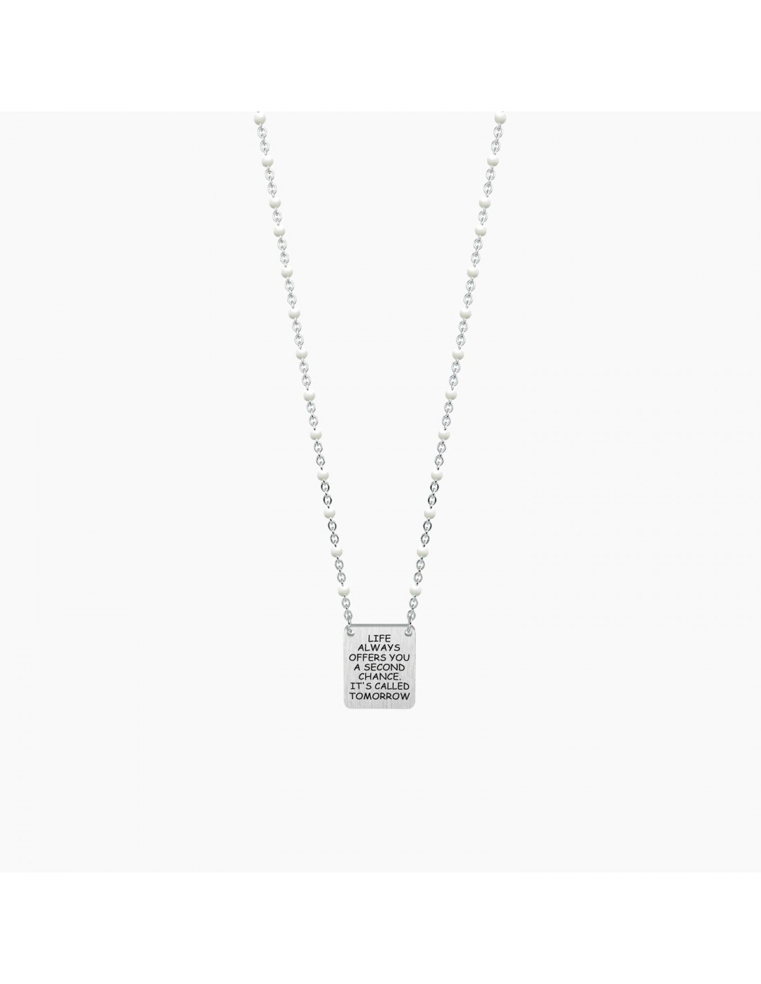 Life always offers you a second chance. It's called tomorrow Collana corta in acciaio con ciondolo satinato a piastrina e catena rol˜ con inserimenti in smalto bianco.