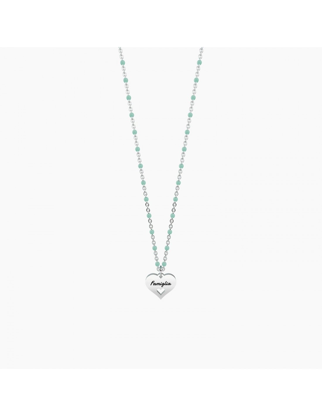 Collana corta in acciaio con ciondolo a cuore e catena rol con inserimenti in smalto verde acqua.