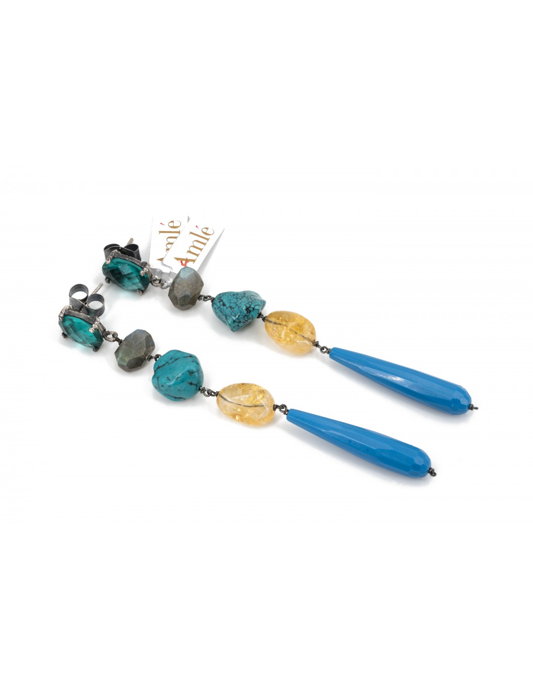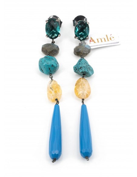 Orecchini Amlè in Argento Brunito (925) e Pietre Naturali ( Pietra turchese e Quarzi ). Tipo di chiusura a Perno con Farfallina.