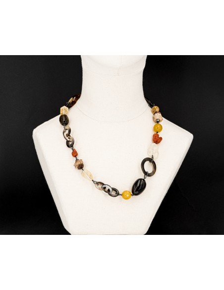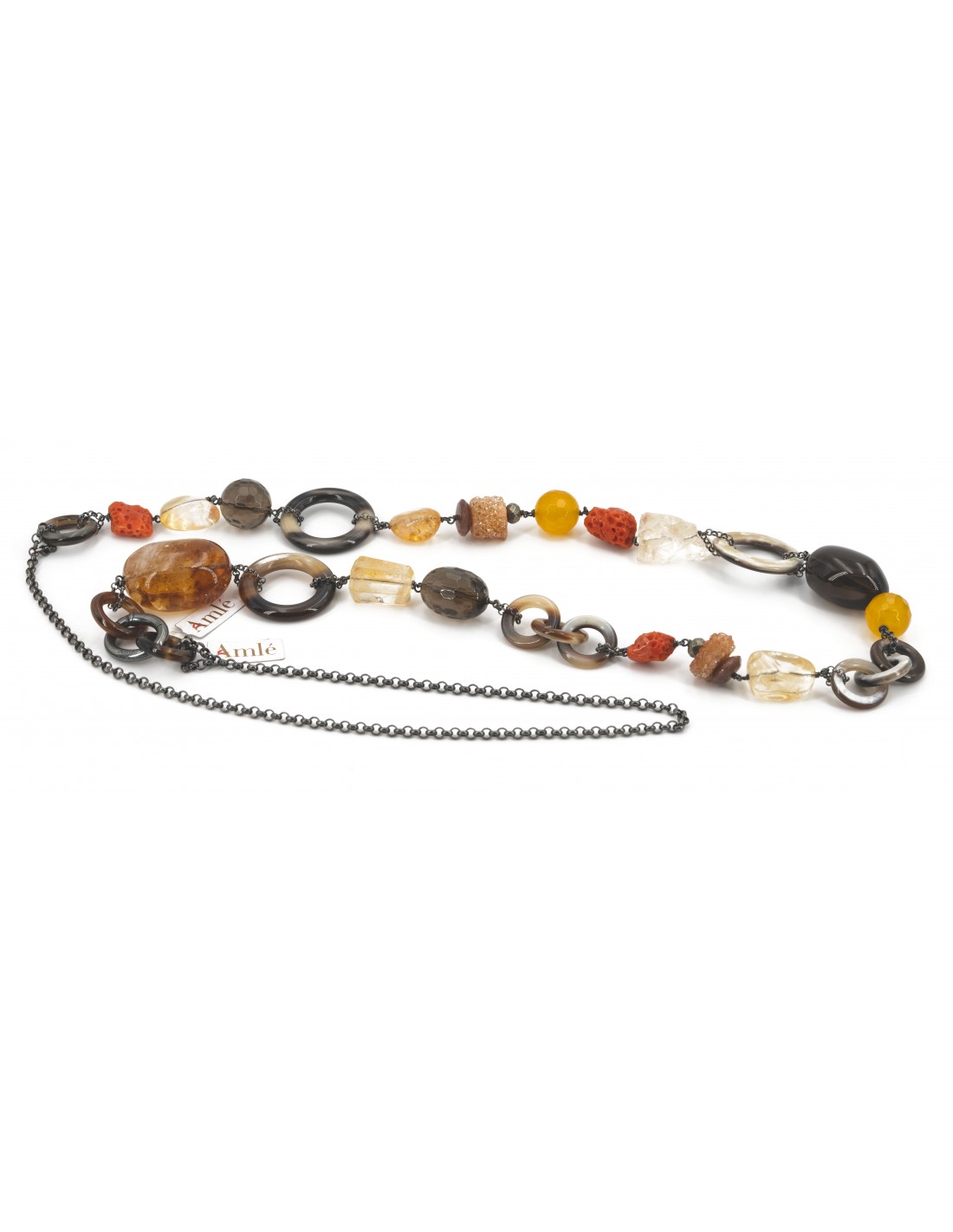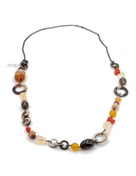 Collana Amlè in Argento (925), Corno Sfumato, Pietre Naturali (Quarzi) e Corallo Rosso . Lunghezza indossata: 48cm