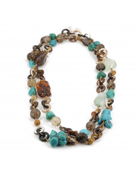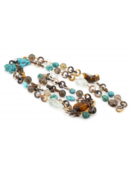 Collana Amlè in Corno Sfumato, Argento (925) e Pietre Naturali ( Quarzi, Pietra Turchese, Ambra ). Lughezza totale 80cm regolabile. Utilizzabile a doppio giro o monogiro.